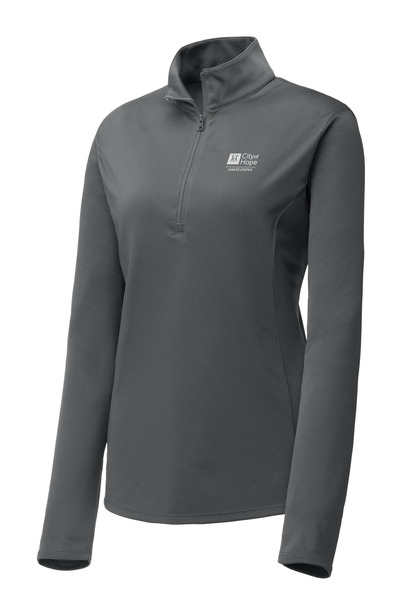 Show your support in style with this City of Hope women's quarter-zip pullover, embroidered with the iconic logo on the chest. Made from lightweight polyester with PosiCharge technology, it locks in color, wicks moisture, and keeps you comfortable all year. A cadet collar, reverse-coil zipper, princess seams, and drop-tail hem create a flattering, modern fit that’s perfect for layering or wearing on its own.