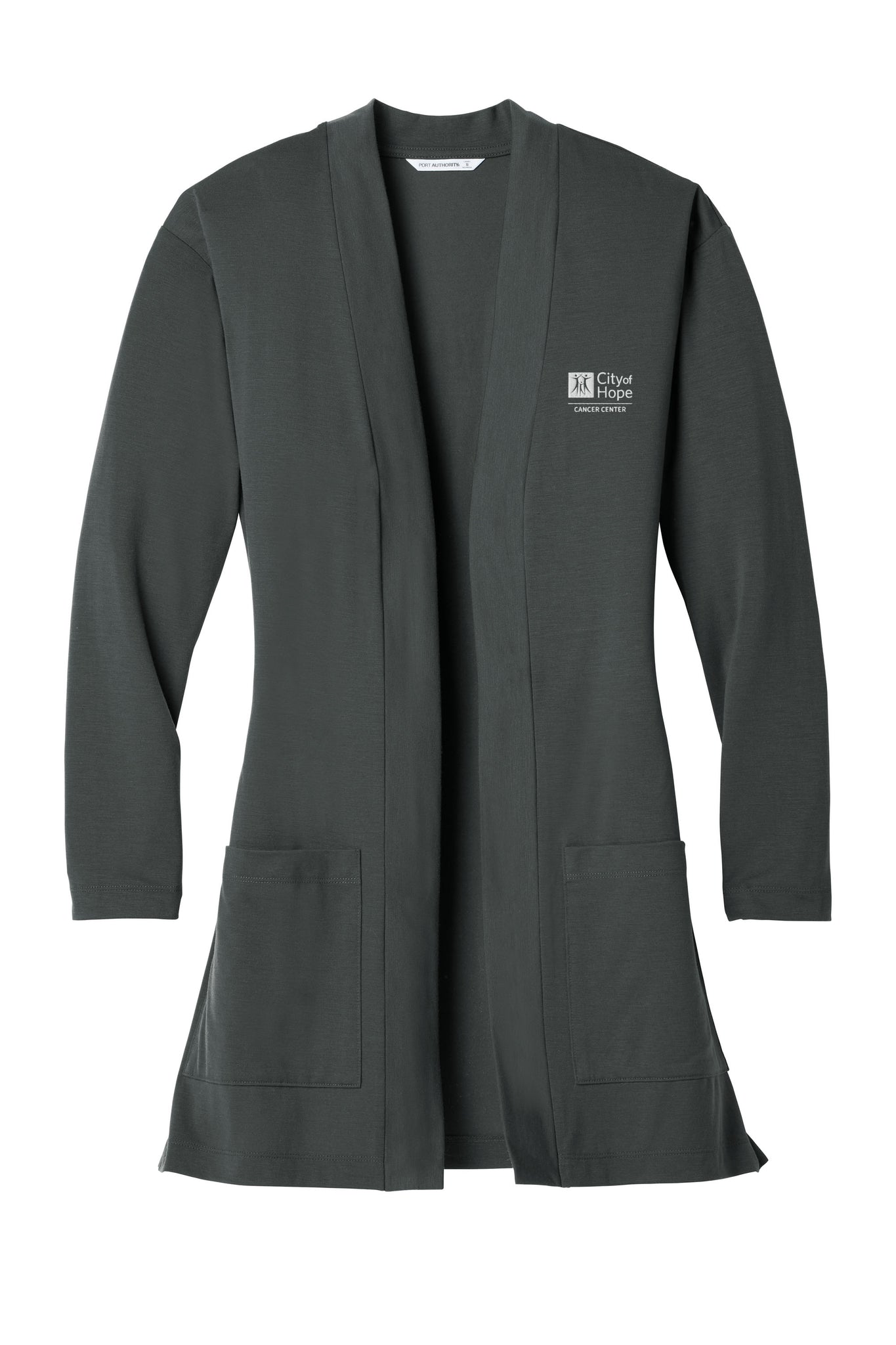 Elevate your everyday layers with this long pocket cardigan, finished with the City of Hope logo embroidered on the left chest. Made from a soft, stretchy jersey knit that moves with you, it features an open-front design, a flattering longer length, and side hem vents for easy comfort. Two roomy patch pockets keep essentials close, making it an effortless, polished piece for busy days—from office to errands and everything in between.